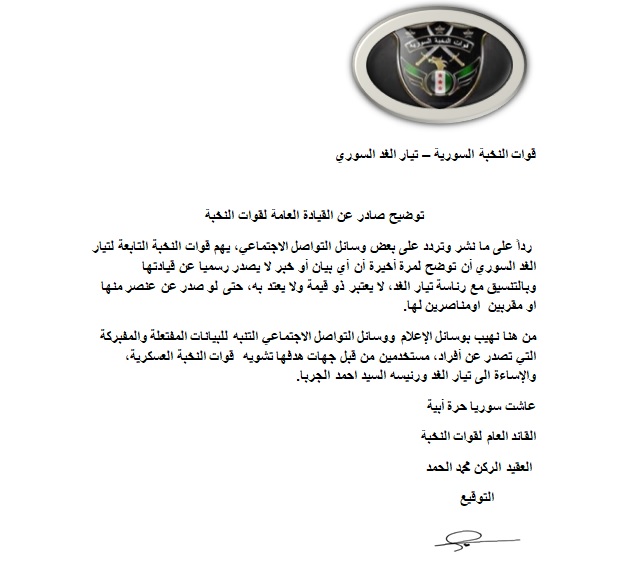 رداً على ما نشر وتردد على بعض وسائل التواصل الاجتماعي، يهم قوات النخبة التابعة لتيار الغد السوري، أن توضح لمرة أخيرة أن أي بيان أو خبر لا يصدر رسميا عن قيادتها وبالتنسيق مع رئاسة تيار الغد، لا يعتبر ذو قيمة ولا يعتد به، حتى لو صدر عن عنصر منها أو مقربين أومناصرين لها.