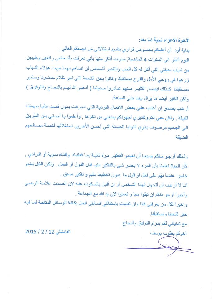 استقالة يعقوب اليوسف أحد أعضاء تجمع شباب سوريا الأم بسبب بعض الأخطاء الفردية