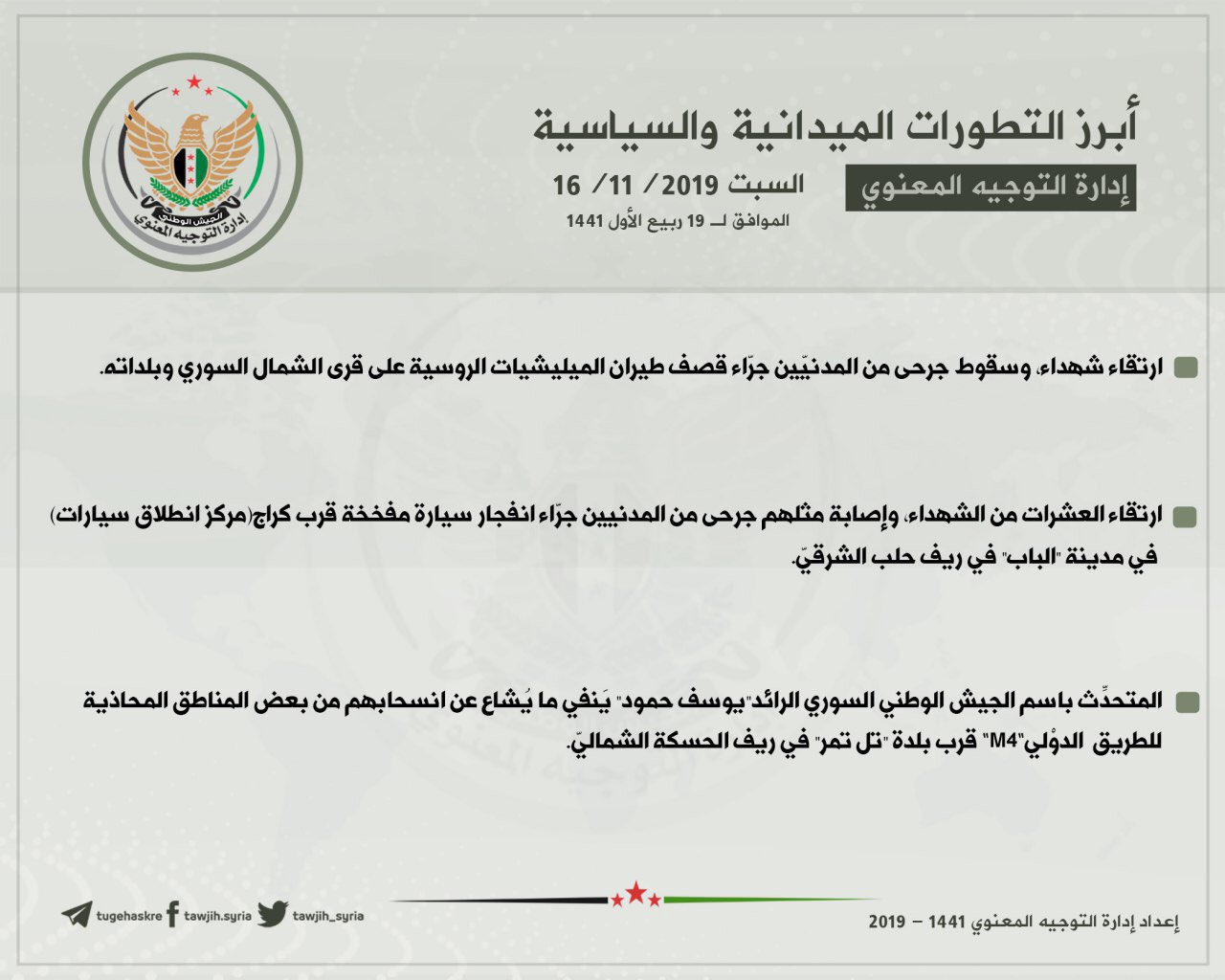 أبرز التطورات الميدانية والسياسية ليوم السبت 16/11/2019