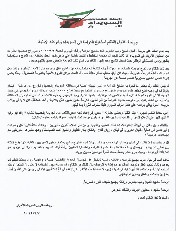 نناشد أهلنا في جبل العرب بجميع شرائحه وعائلاته ، التنبه لمخاطر هذه الجريمة وأبعادها وتلفيقاتها الأمنية والإعلامية ، وما يخطط النظام لما بعدها، ونأمل تحكيم العقل وتوحيد الصفّ ،وعدم إضاعة البوصلة بانّ القاتل هو النظام ، إن جريمة بهذه الضخامة لا يمكن أنّ تنفذها إلّا هذه السلطة الأمنية، وما قاله وافد أبو ترابه هي شهادة زورّ، لّا تصدقوا هذه الأكاذيب كي لا نقع في فخّ الفتنة بين الأهالي . ونحن على ثقة أن أهلنا يمتازون بالحكمة و العقل وصون دم أبنائهم.