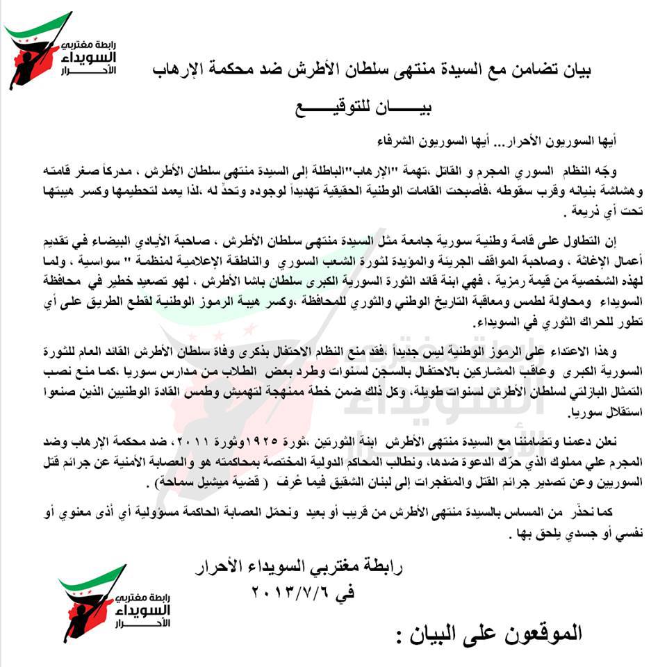 نعلن دعمنا وتضامننا مع السيدة منتهى الأطرش ابنة الثورتين ،ثورة 1925وثورة 2011، ضد محكمة الإرهاب وضد المجرم علي مملوك الذي حرّك الدعوة ضدها، ونطالب المحاكم الدولية المختصة بمحاكمته هو والعصابة الأمنية عن جرائم قتل السوريين وعن تصدير جرائم القتل والمتفجرات إلى لبنان الشقيق فيما عُرِفَ ( بقضية ميشيل سماحة) .