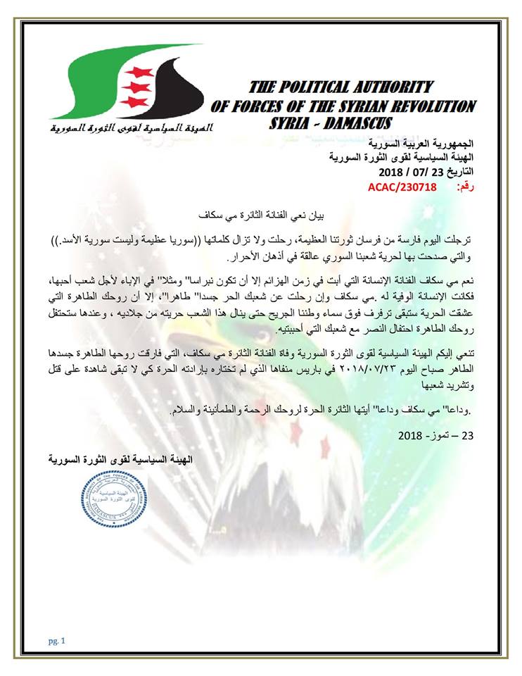 بيان من الهيئة السياسية لقوى الثورة السورية تنعي فيه الفنانة مي سكاف