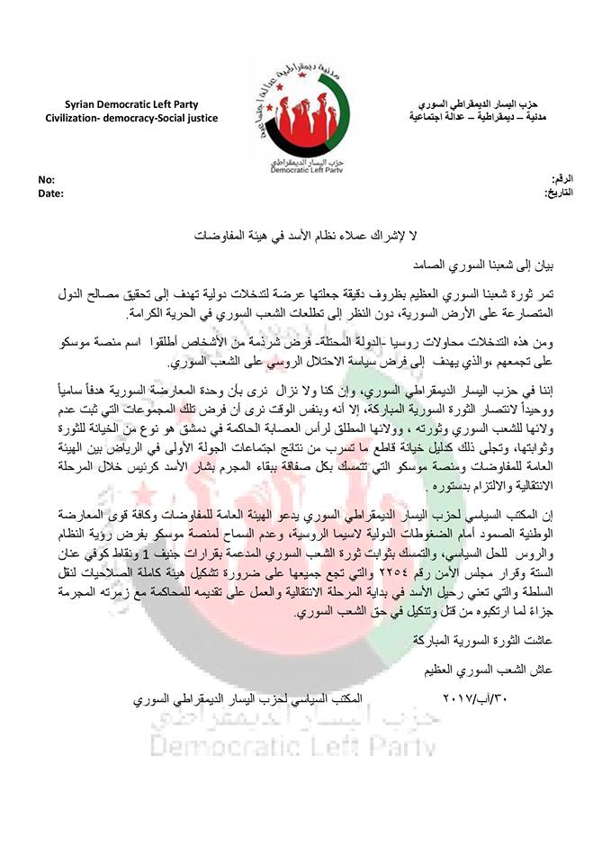 حزب اليسار الديمقراطي: لا لإشراك عملاء في الهيئة المفاوضات