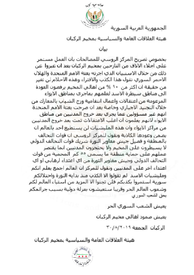 بيان من هيئة العلاقات العامة والسياسية لمخيم الركبان بخصوص إعلان مركز المصالحة الروسي بأن العمل مستمر على إجلاء ألاف النازحين من المخيم
