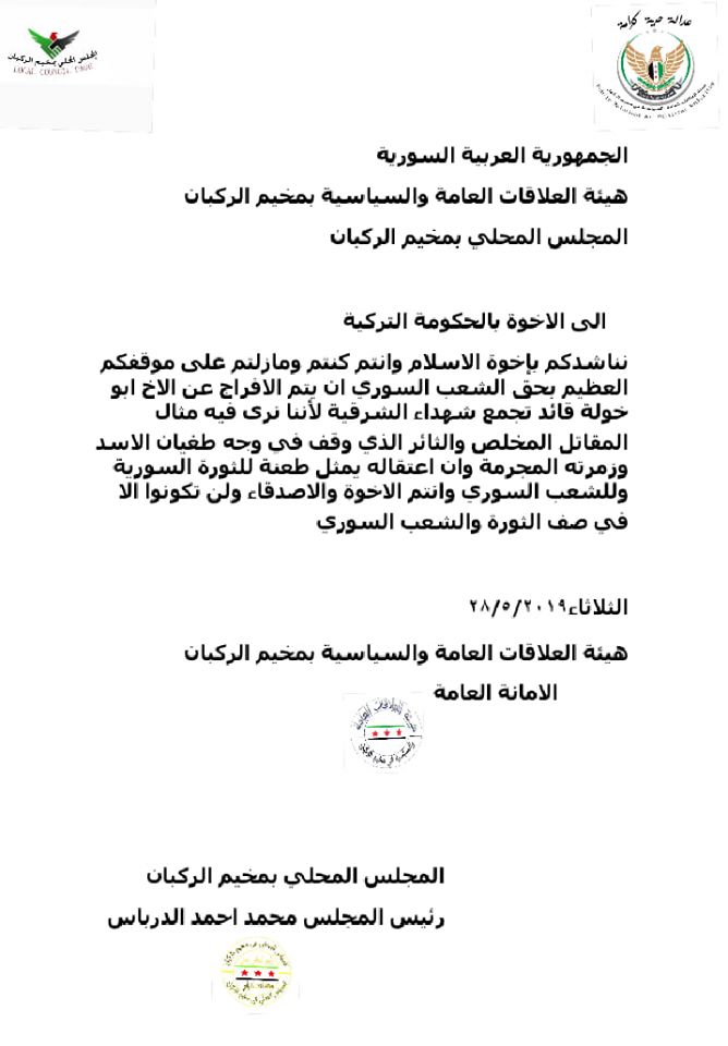 هيئة العلاقات العامة والسياسية لمخيم الركبان تناشد الحكومة التركية بالإفراج عن قائد تجمع شهداء الشرقية