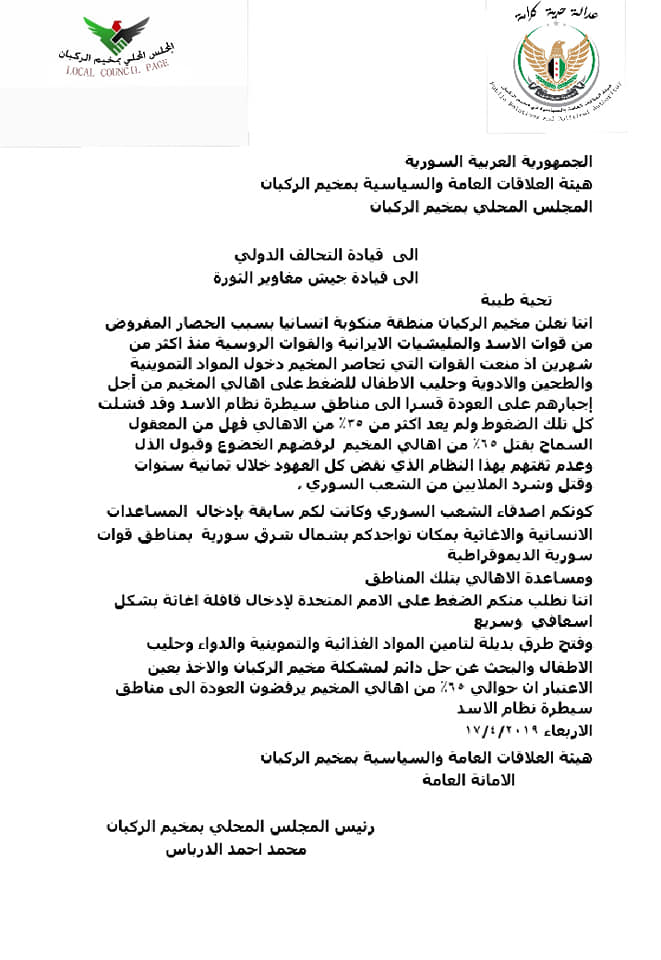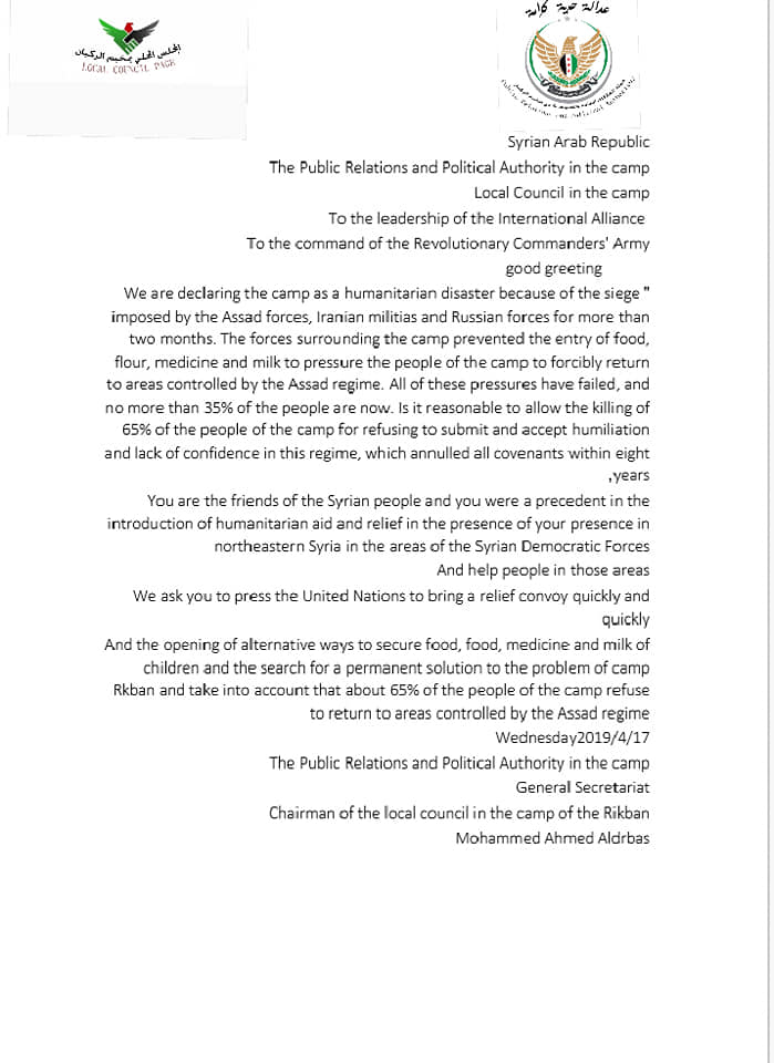 بيان من هيئة العلاقات العامة والسياسية لمخيم الركبان إلى قيادة التخالف الدولي وقيادة جيش مغاوير الثورة