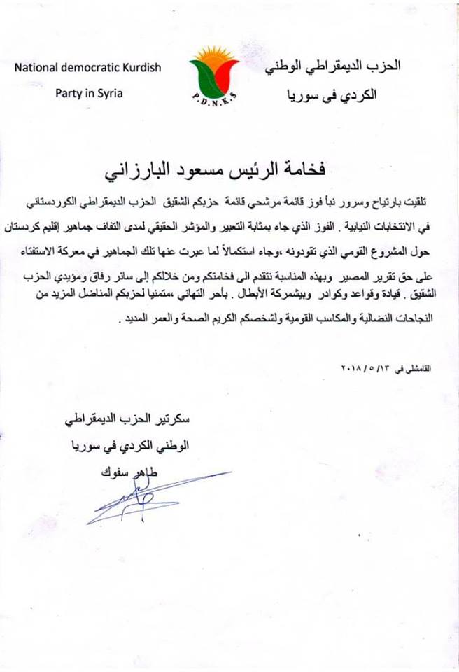 الحزب الديمقراطي الوطني الكردي في سوريا يهنئ الرئيس مسعود البارزاني بفوز قائمة مرشحي حزبه في الانتخابات النيابية