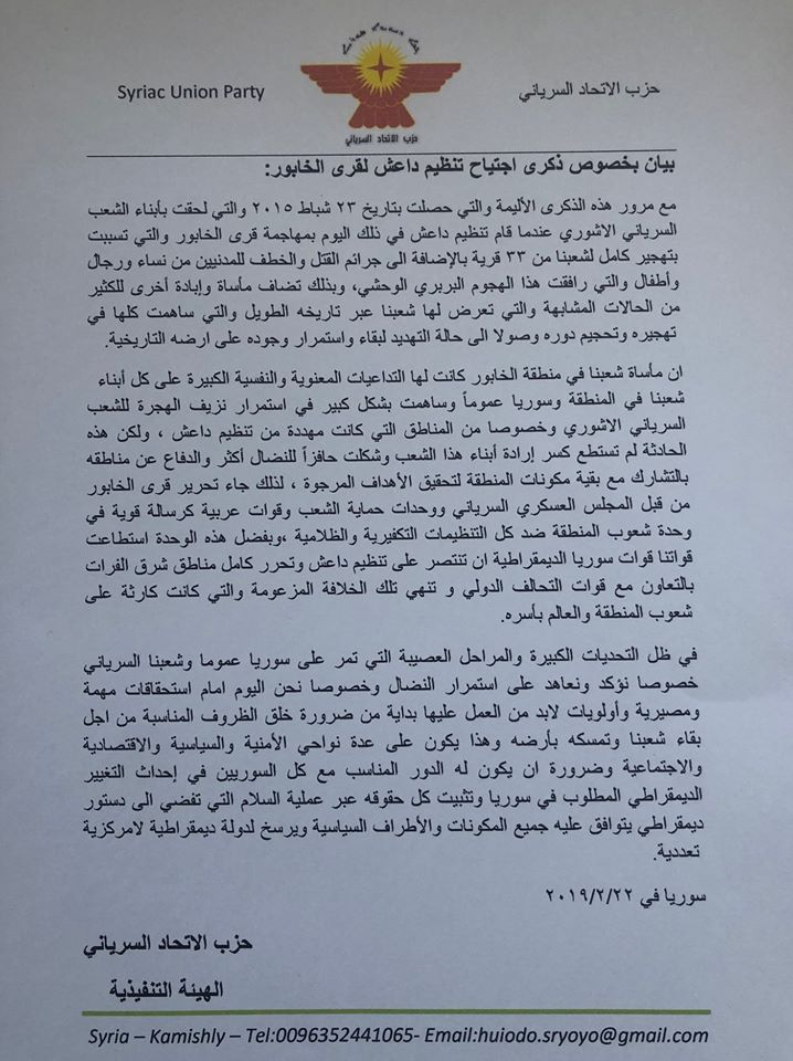 مع مرور هذه الذكرى الأليمة والتي حصلت بتاريخ 23 شباط 2015 والتي لحقت بأبناء الشعب السرياني الاشوري عندما قام تنظيم داعش في ذلك اليوم بمهاجمة قرى الخابور والتي تسببت بتهجير كامل لشعبنا من 33 قرية بالإضافة الى جرائم القتل والخطف للمدنيين من نساء ورجال وأطفال والتي رافقت هذا الهجوم البربري الوحشي، وبذلك تضاف مأساة وإبادة أخرى للكثير من الحالات المشابهة والتي تعرض لها شعبنا عبر تاريخه الطويل والتي ساهمت كلها في تهجيره وتحجيم دوره وصولا الى حالة التهديد لبقاء واستمرار وجوده على ارضه التاريخية.
