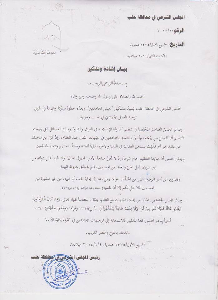 المجلس الشرعي في محافظة حلب يشيد بتشكيل جيش المجاهدين