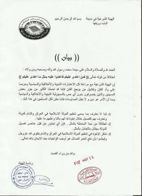 الهيئة الشرعية في مدينة الباب وريفها تصدر بياناً ترفض فيه الإعتراف بـ " دولة الإسلام في العراق والشام" كدولة