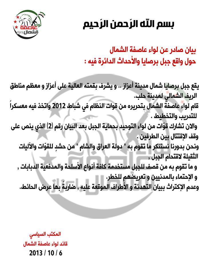 بيان صادر عن لواء عاصفة الشمال حول واقع جبل برصايا والأحداث الدائرة فيه