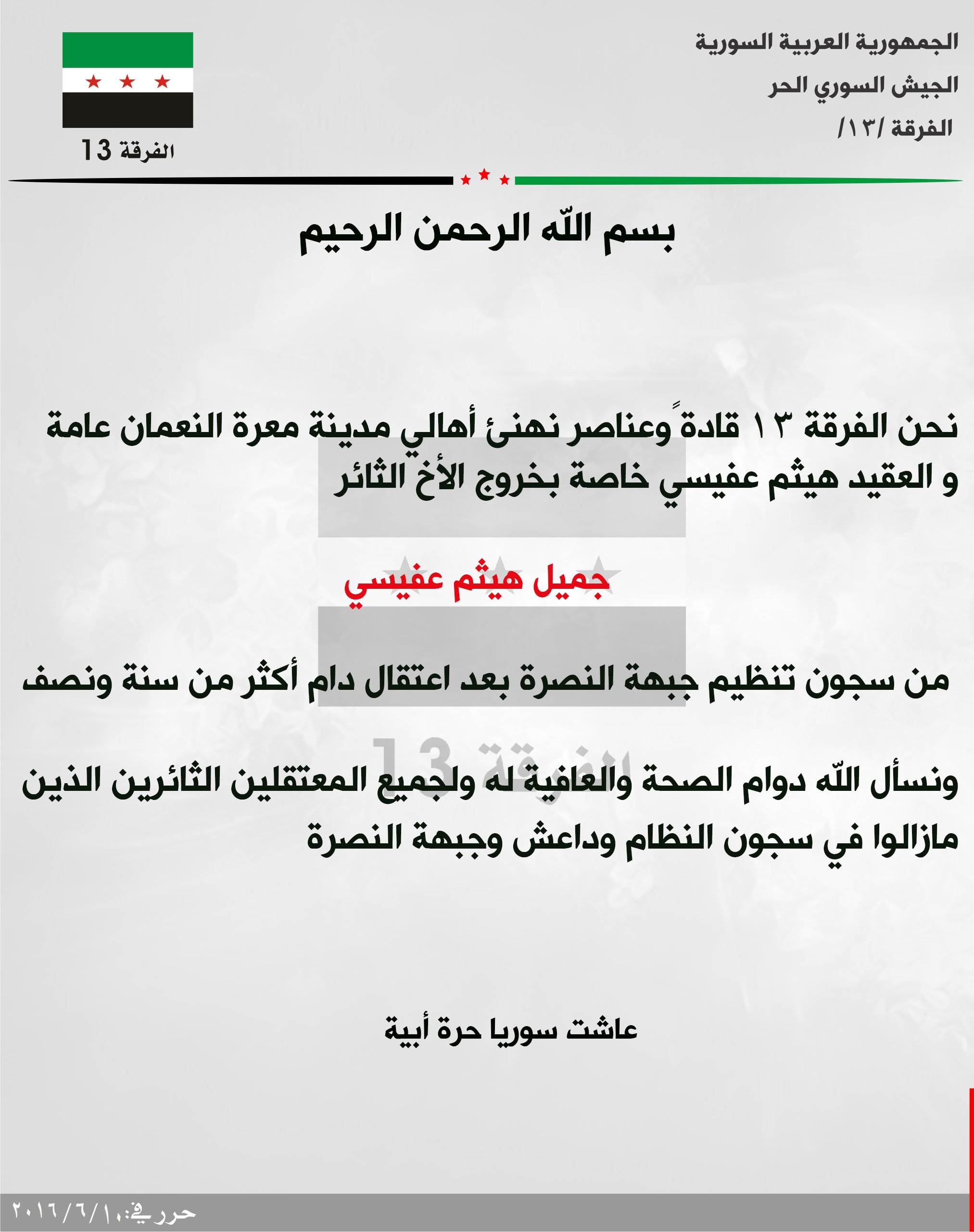 الفرقة 13 تهنئ أهالي مدينة معرة النعمان والعقيد هيثم العفيسي بخروج جميل هيثم العفيسي من سجون جبهة النصرة