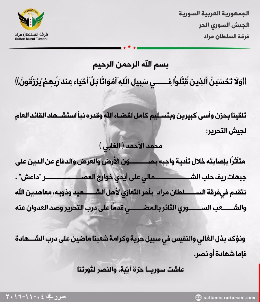 فرقة السطان مراد تعزي جيش التحرير بقائدها العام محمد الأحمد (الغابي) في الإشتباكات الجارية ضد تنظيم الدولة في ريف حلب الشمالي