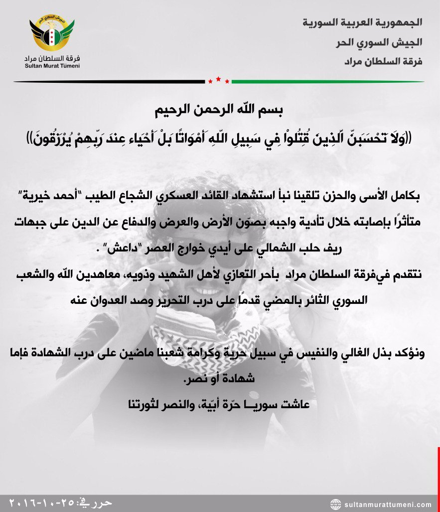 فرقة السطان مراد تنعي القائد العسكري أحمد خيرية على جبهات ريف حلب الشمالي ضد تنظيم الدولة