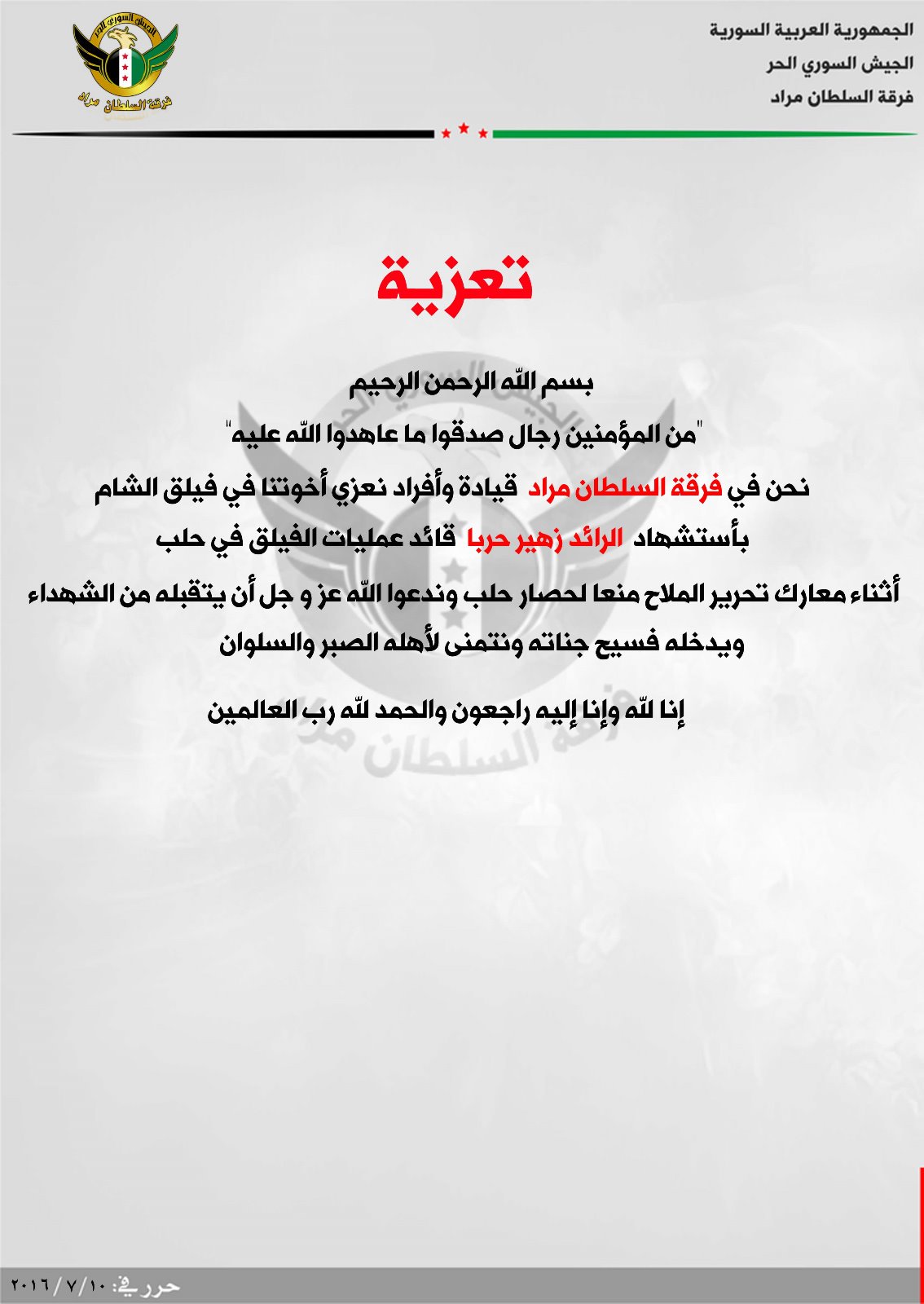 فرقة السطان مراد تعزي فيلق الشام بقائد عملياته الرائد زهير حربا
