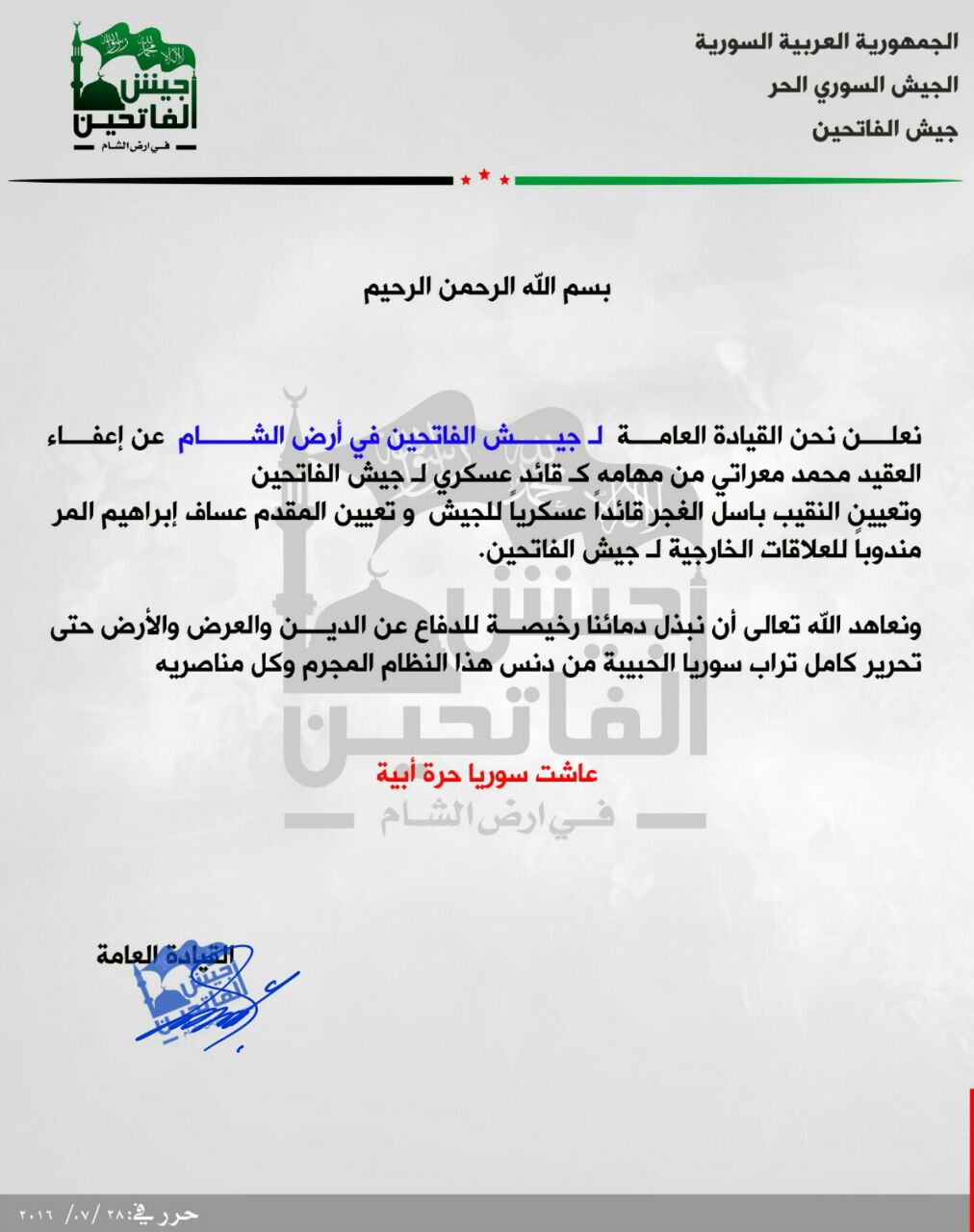 القيادة العامة لجيش الفاتحين تقرر عزل العقيد محمد معراتي من القيادة العسكرية للجيش وتعيين بدلاً عنه النقيب باسل الغجر قائداً عسكرياً جديداً