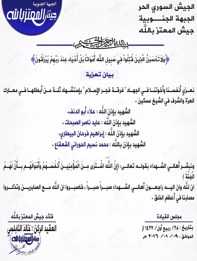 جيش المعتز بالله يعزي فرقة جيش فجر الإسلام بمجموعة من مقاتليها على جبهة الشيخ مسكين
