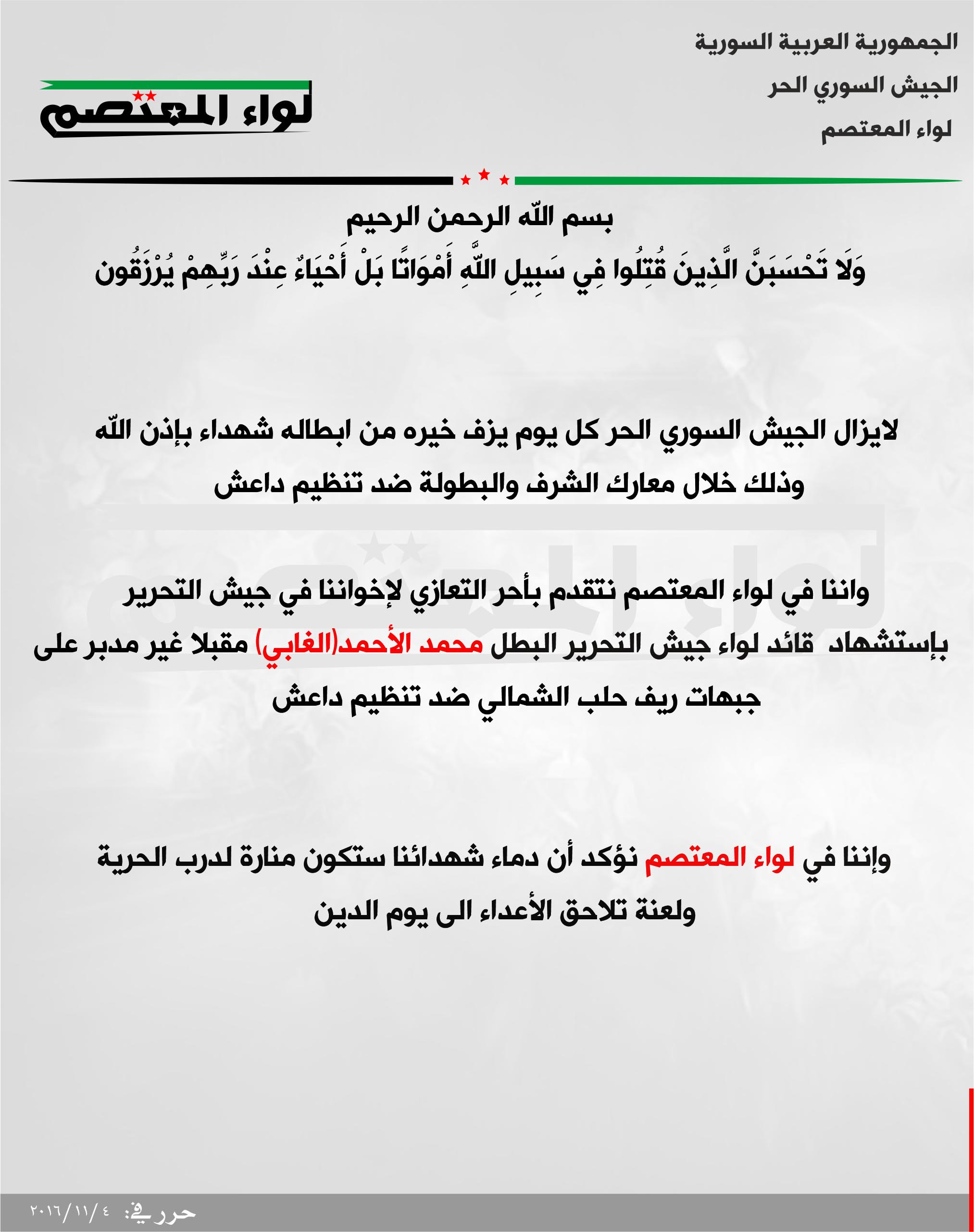 لواء المعتصم يعزي جيش التحرير بقائده العام محمد الأحمد الغابي على جبهات ريف حلب الشمالي ضد تنظيم الدولة