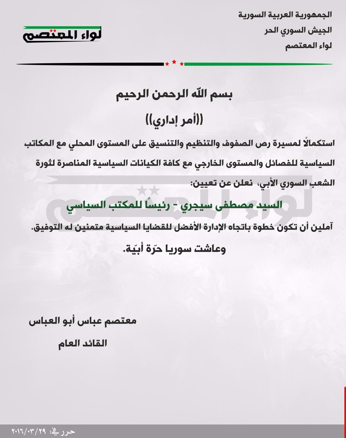 قرار من لواء المعتصم بتعيين مصطفى سيجري رئيساً للمكتب السياسي التابع للواء