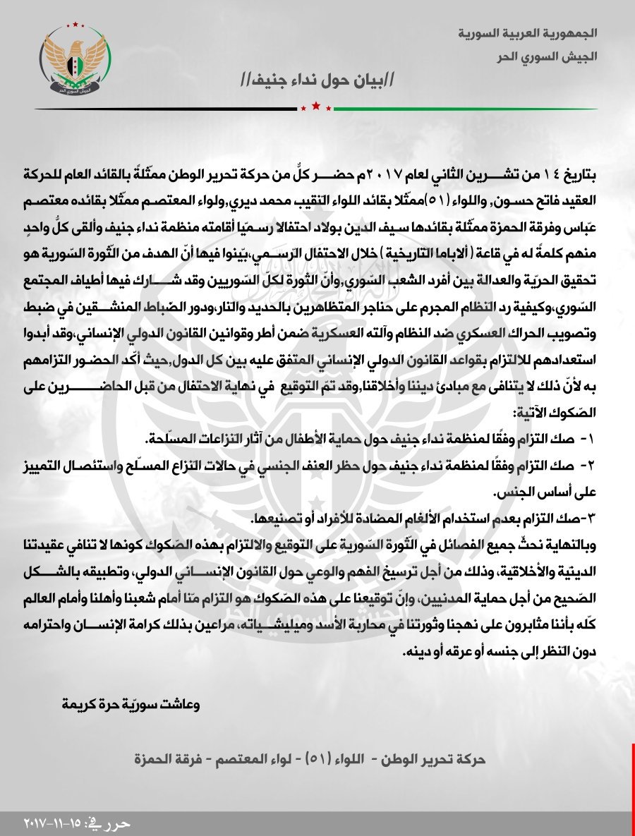 بيان مشترك لمجموعة من الفصائل حول التزامها بالميثاق الموقع خلال احتفالية منظمة نداء جنيف