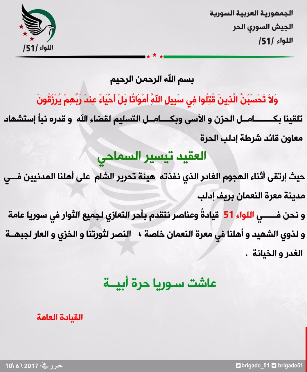 اللواء 51 يعزي أهالي معرة النعمان بالعقيد تيسير سماحي نائب قائد شرطة إدلب الحرة الذي استشهد علي يد هيئة تحرير الشام