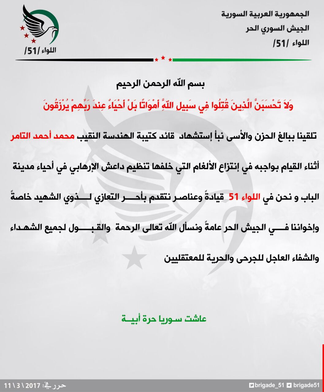 اللواء 51 يعزي فرقة السطان مراد بالقائد العسكري علاء حنورة أثناء مشاركته في تحرير قرية بزاعة من تنظيم الدولة