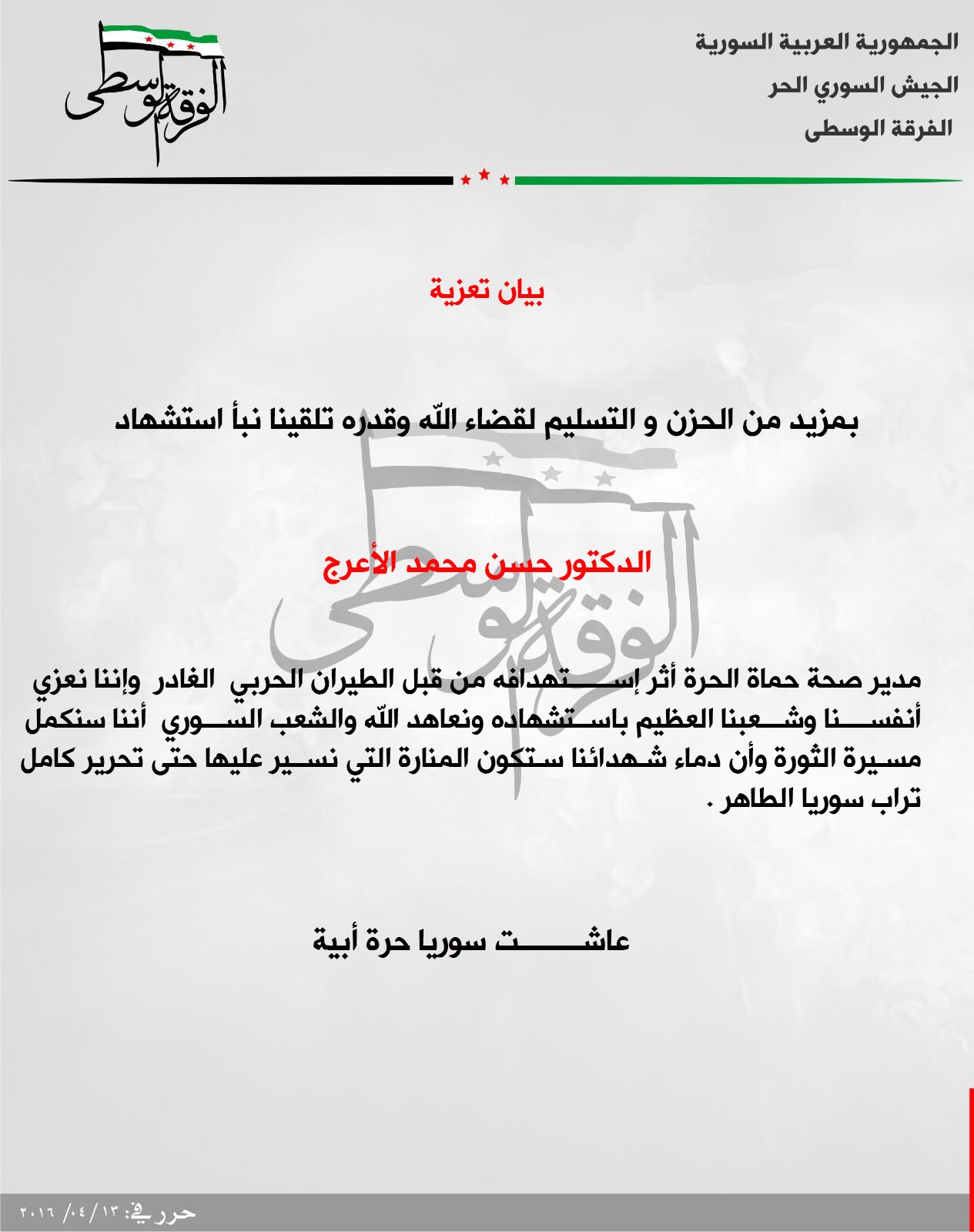الفرقة الوسطى تعزي بمدير صحة حماة الدكتور حسن محمد الأعرج بغارة جوية غادرة