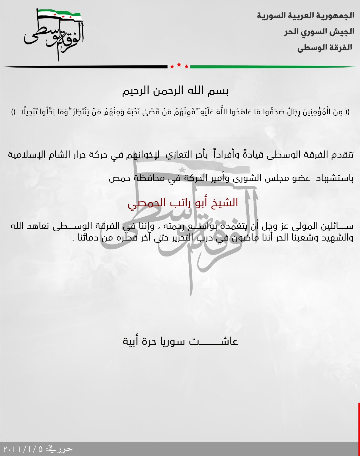 الفرقة الوسطى تعزي حركة أحرار الشام بعضو مجلس شورتها وأمير الحركة في محافظة حمص الشيخ أبو راتب الحمصي