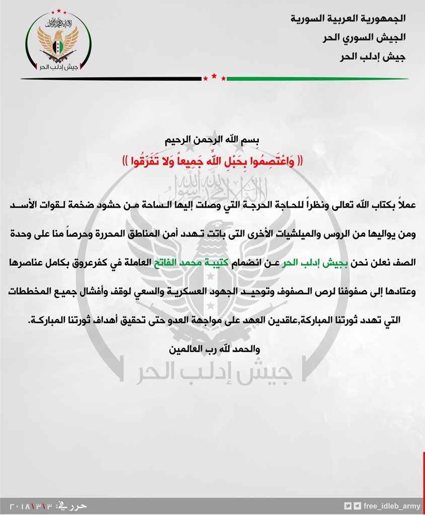 جيش إدلب الحر يعلن عن انضمام كتيبة محمد الفاتح العاملة في كفر عروق بكامل عتادها إلى صفوفه