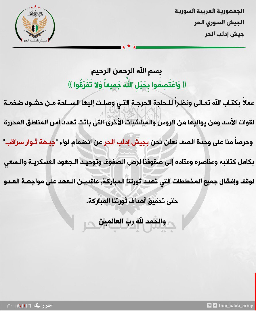 جيش إدلب الحر يعلن عن انضمام جبهة ثوار سراقب بكامل كتائبها وعتادها إلى صفوفه
