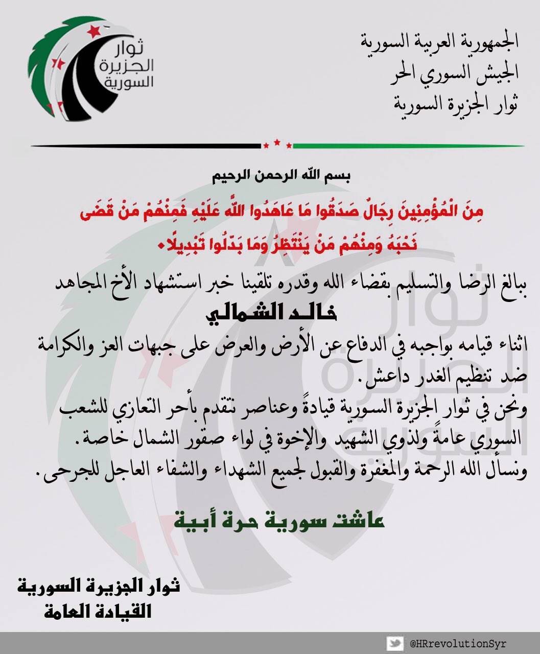 ثوارالجزيرة السورية يعزي لواء صقور الشمال بأحد قادته خالد الشمالي بالإشتباكات مع تنظيم الدولة