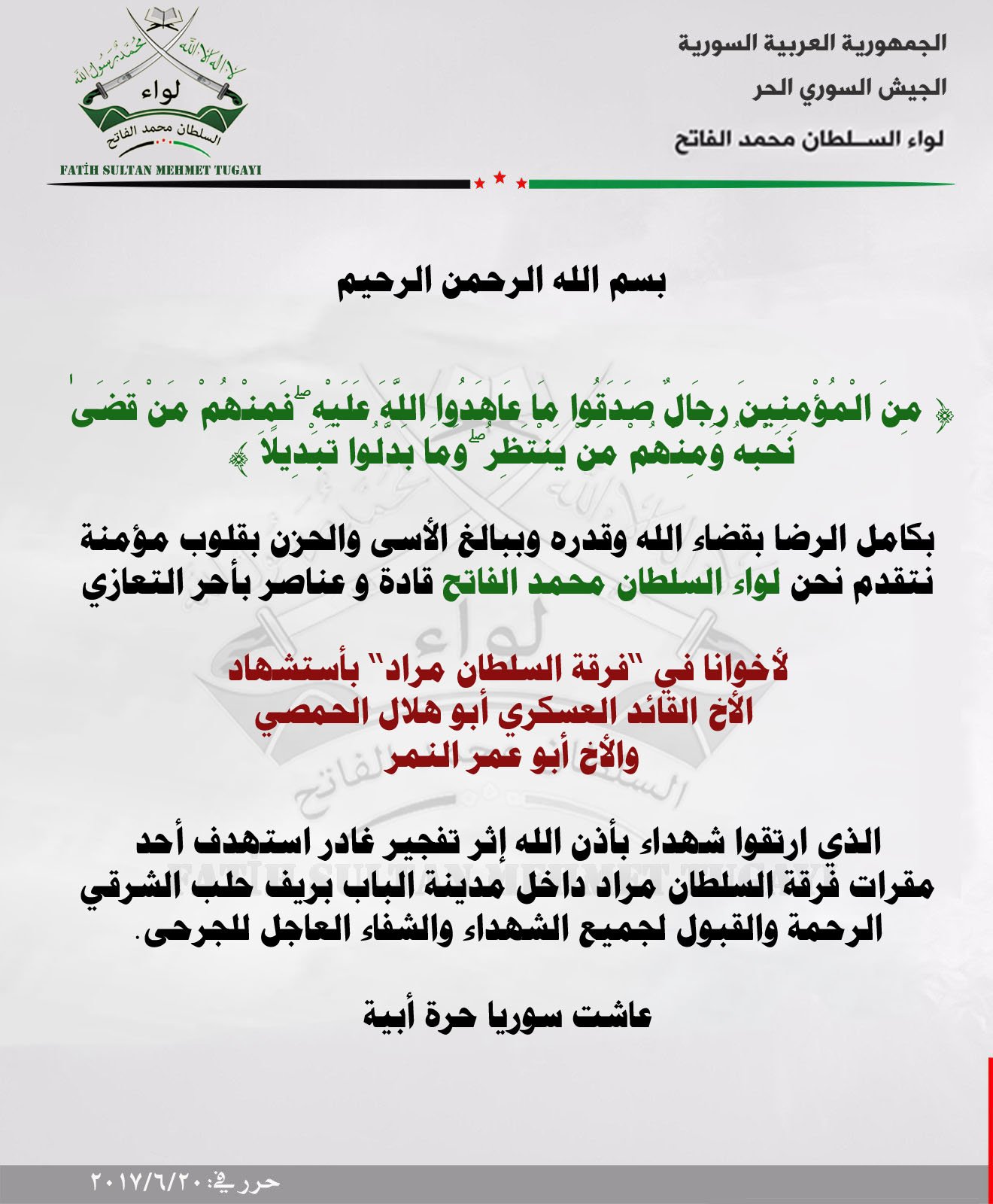 لواء السطان محمد الفاتح يعزي فرقة السطان مراد بالقائد العسكري أبو هلال الحمصي بتفجير في مدينة الباب