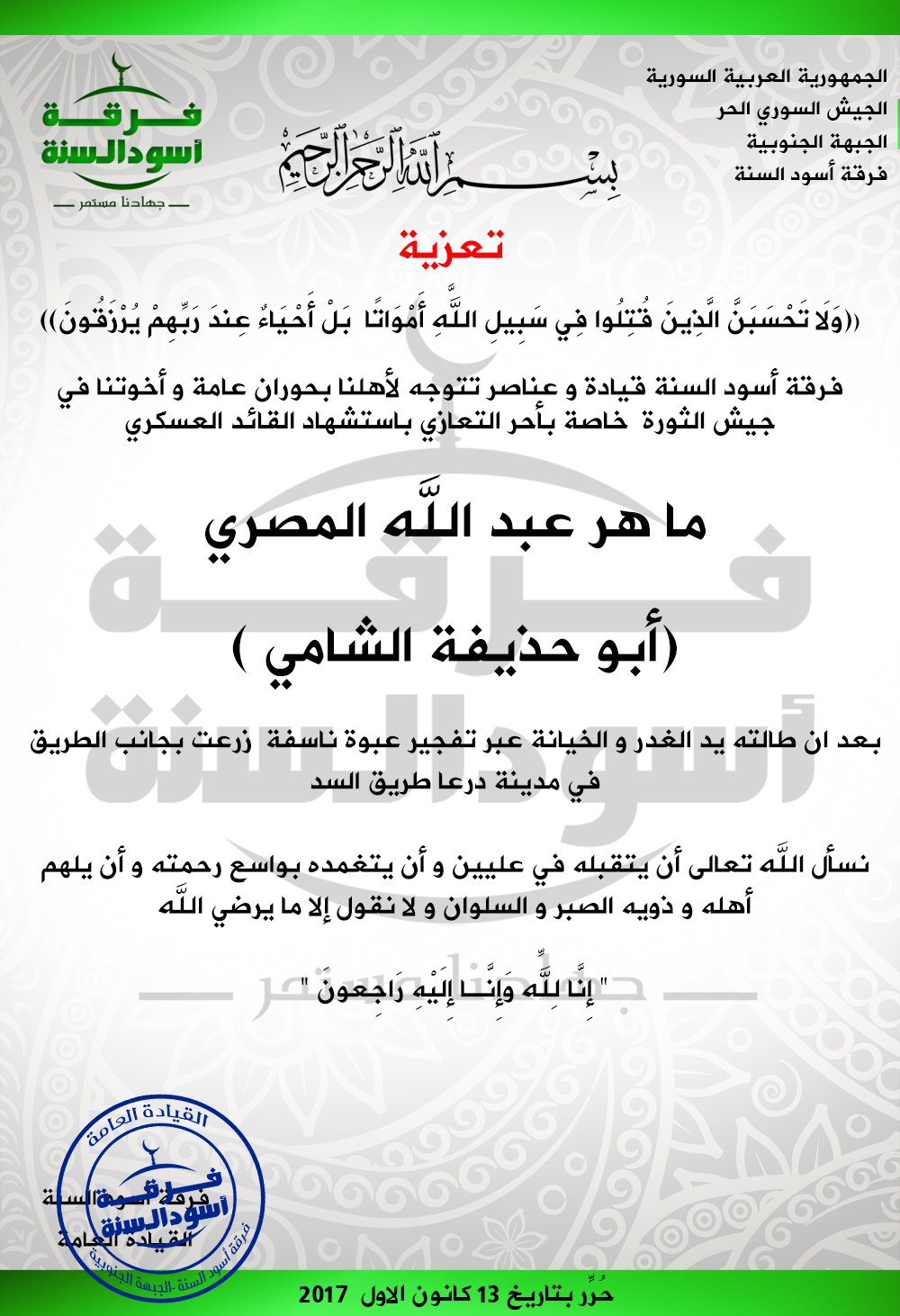 فرقة أسود السنة تعزي جيش الثورة بالقائد العسكري ماهر عبد الله المصري
