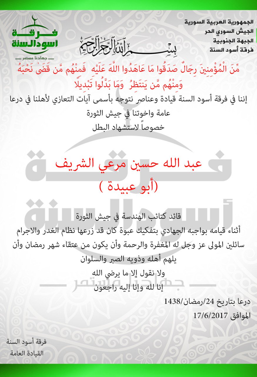 فرقة أسود السنة تعزي جيش الثورة بقائد كتائب الهندسة عبد الله حسين مرعي الشريف