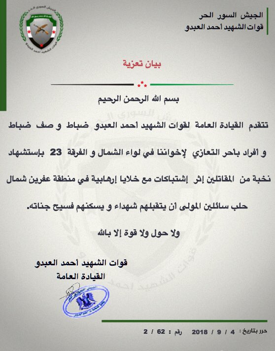 قوات الشهيد أحمد العبدو تعزي لواء الشمال والفرقة 23 بمجموعة من مقاتليهم بريف عفرين