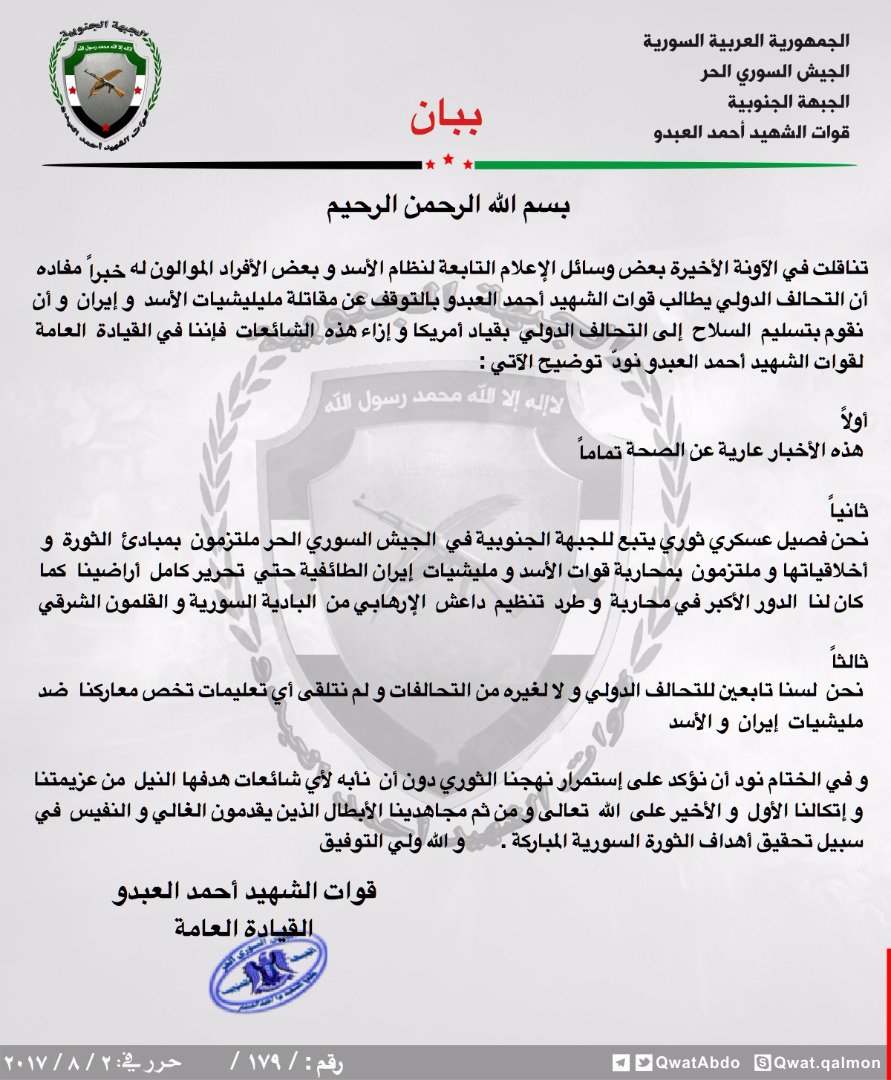 بيان من قوات الشهيد أحمد العبدو ينفي فيه الشائعات التي انتشرت حول طلب التحالف الدولي منه التوقف عن قتال نظام الأسدتسليم أسلحته
