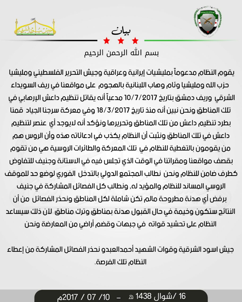 بيان من قوات الشهيد أحمد العبدو وجيش أسود الشرقية حول هجوم المليشيات الطائفية على مواقعها في ريف السويداء بغطاء جوي روسي