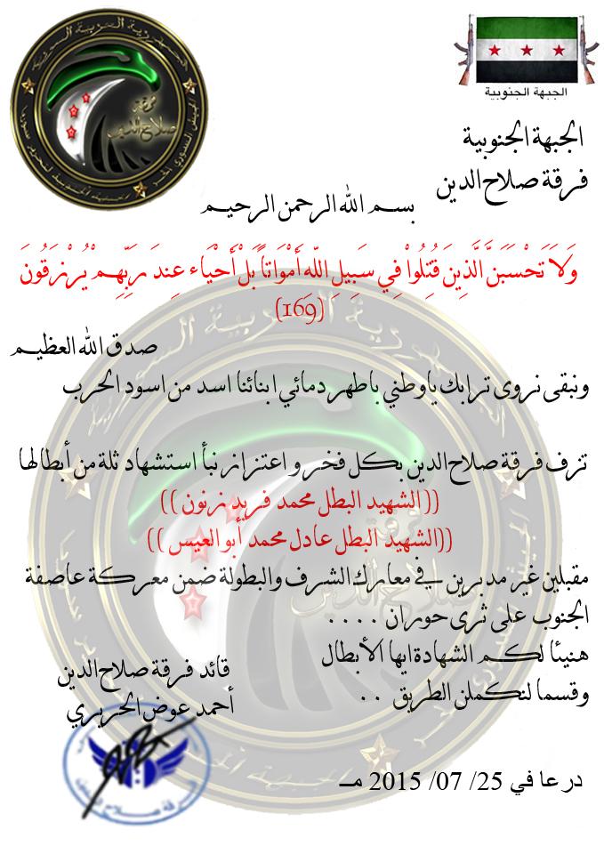 فرقة صلاح الدين تنعي عدداً من مقاتليها في معركة عاصفة الجنوب في درعا