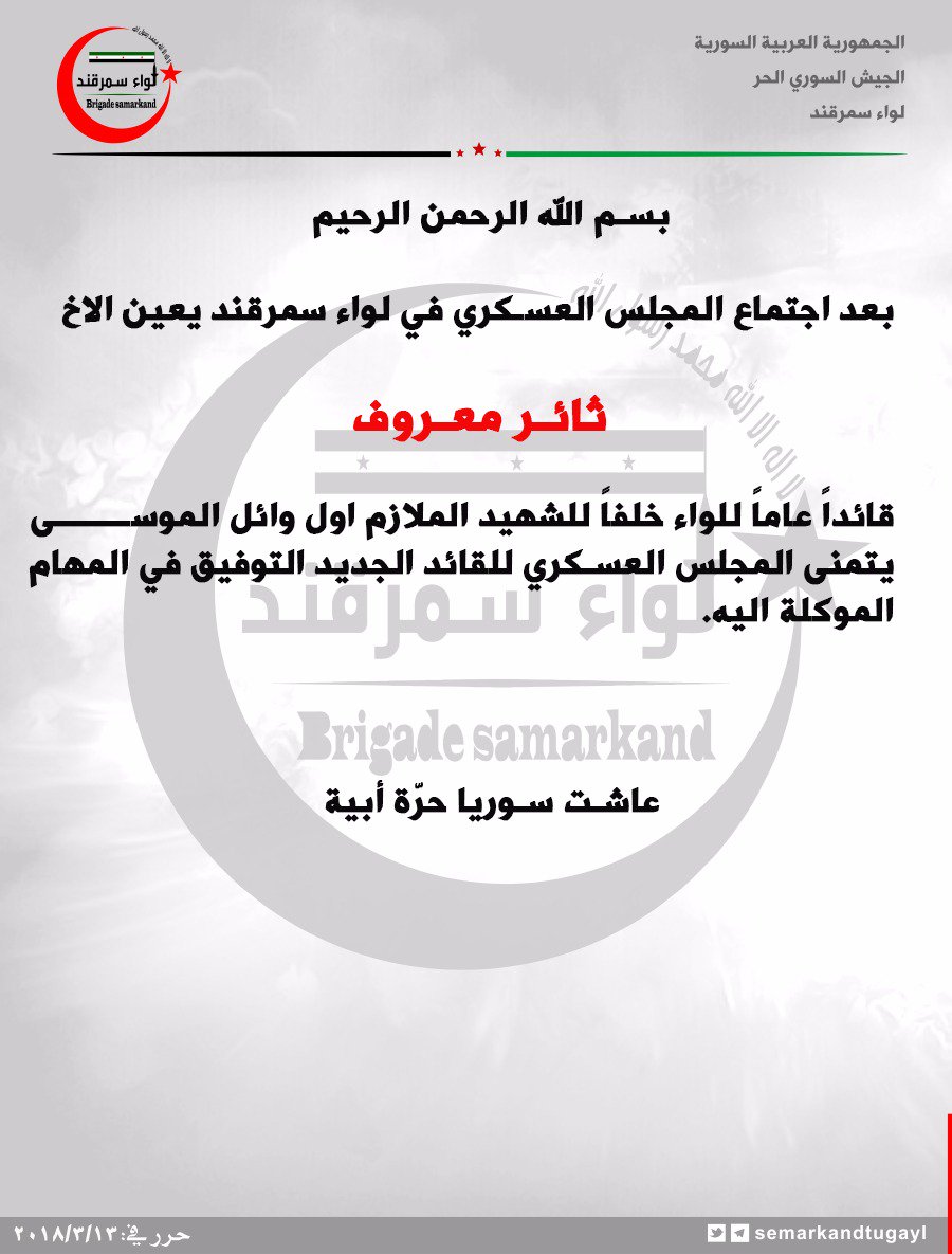 المجلس العسكري في لواء سمرقند يعين ( ثائر معروف ) قائداً للواء خلفاً للملازم أول وائل موسى