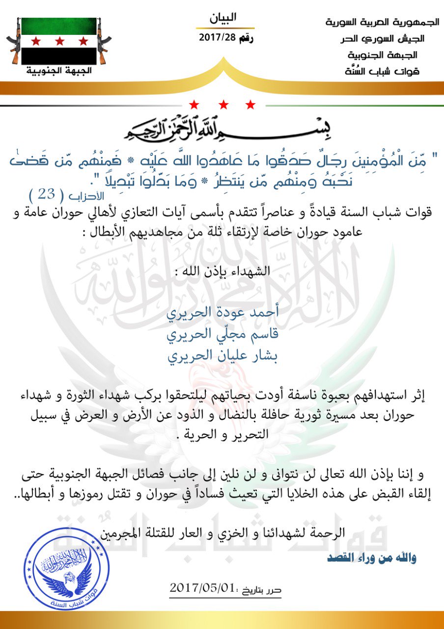 قوات شباب السنة تعزي لواء عامود حوران بمجموعة من مقاتليه بتفجير استهدفهم