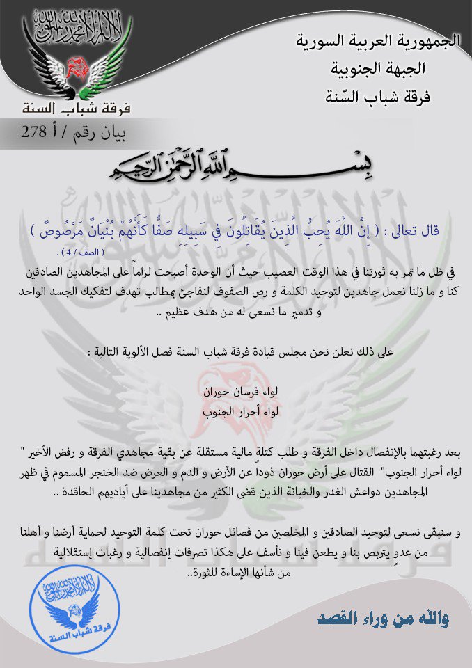 قرار إداري من فرقة شباب السنة بفصل لواء فرسان حوران ولواء أحرار الجنوب من الفرقة