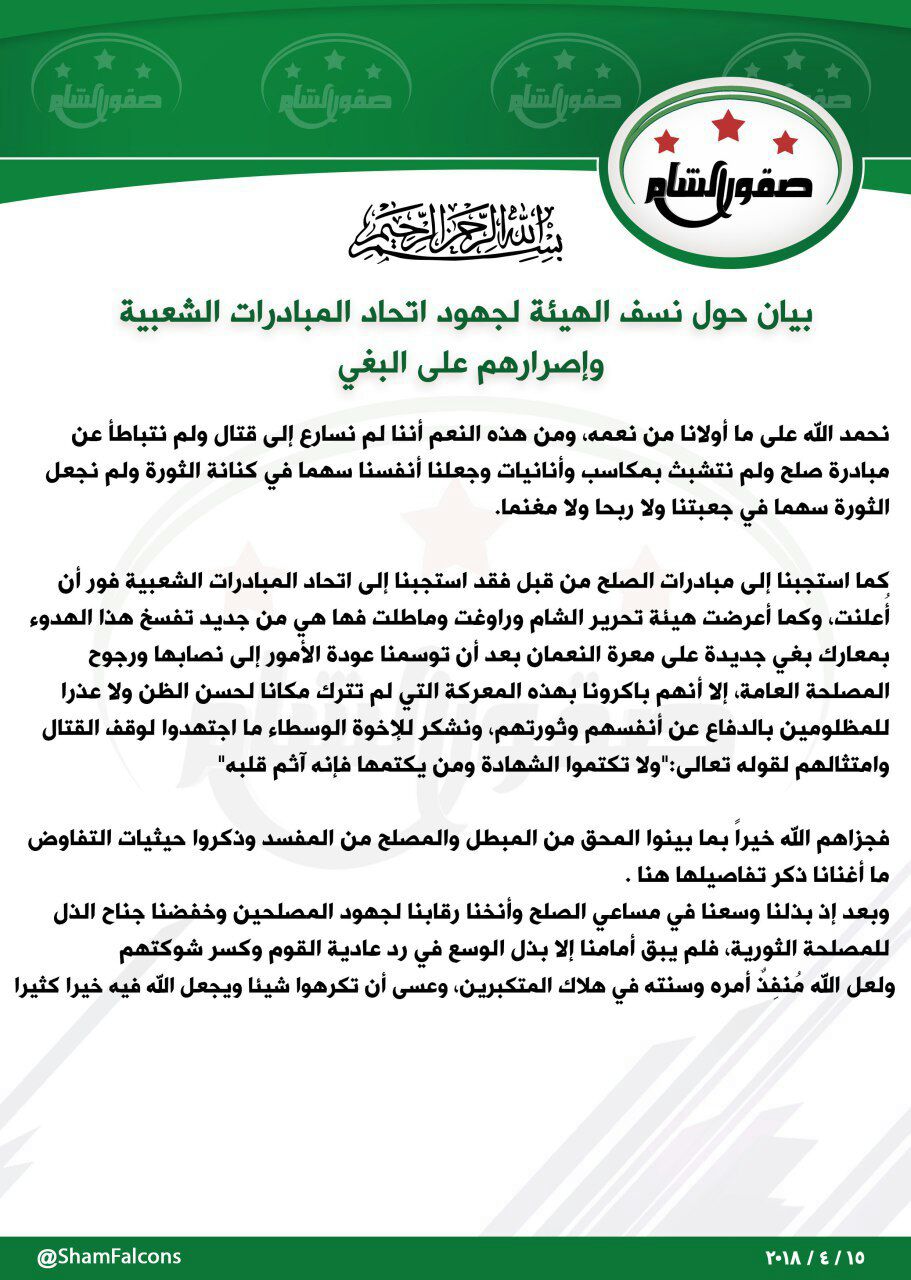 بيان ألوية صقور الشام حول نسف هيئة تحرير الشام لجهود اتحاد المبادرات الشعبية وإصرارهم على البغي
