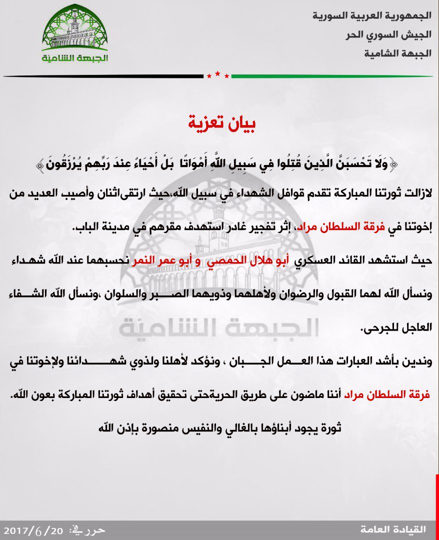 الجبهة الشامية تعزي فرقة السطان مراد بالقائد العسكري أبو هلال الحمصي بتفجير استهدفه في مدينة الباب