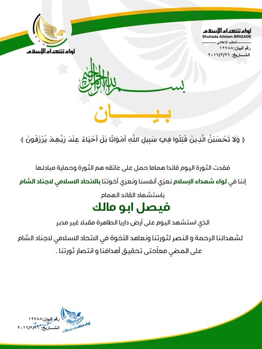 لواء شهداء الإسلام يعزي الإتحاد الإسلامي لأجناد الشام بالقائد فيصل أبو مالك في داريا