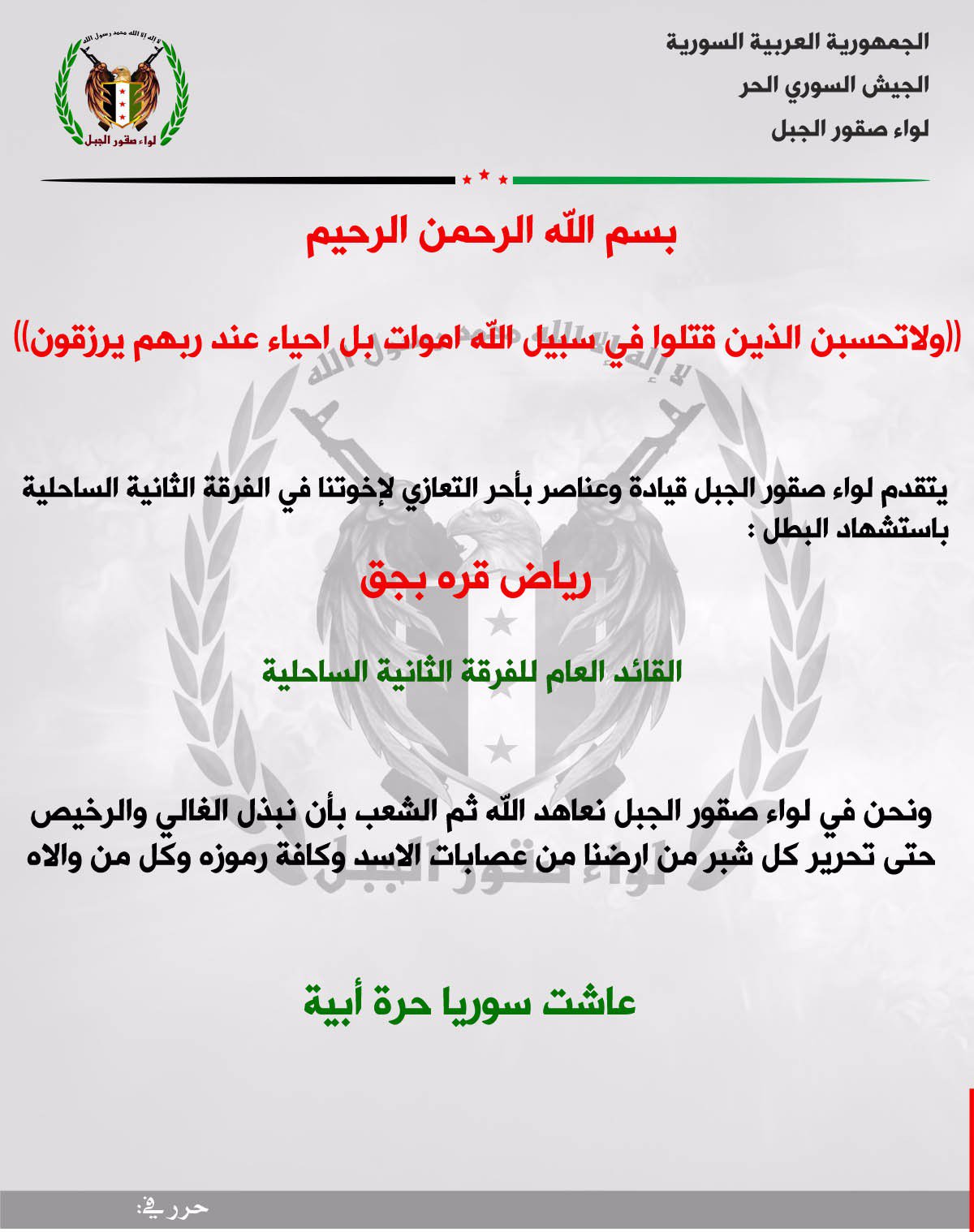لواء صقور الجبل يعزي الفرقة الساحلية الثانية بقائدها العام رياض قره بجق