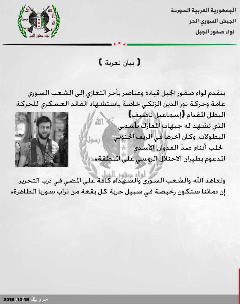 لواء صقور الجبل يعزي حركة نورالدين الزنكي بقائدها العسكري إسماعيل ناصيف في معارك ريف حلب الجنوبي