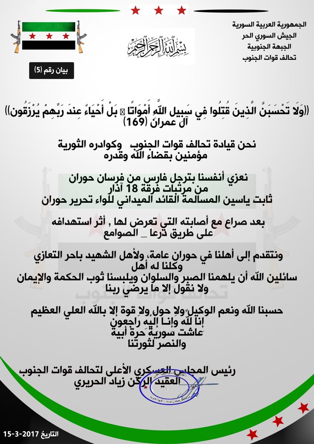 ثحالف قوات الجنوب تعزي فرقة 18 آذار بالقائد الميداني في لواء تحرير حوران ثابت ياسين مسالمة