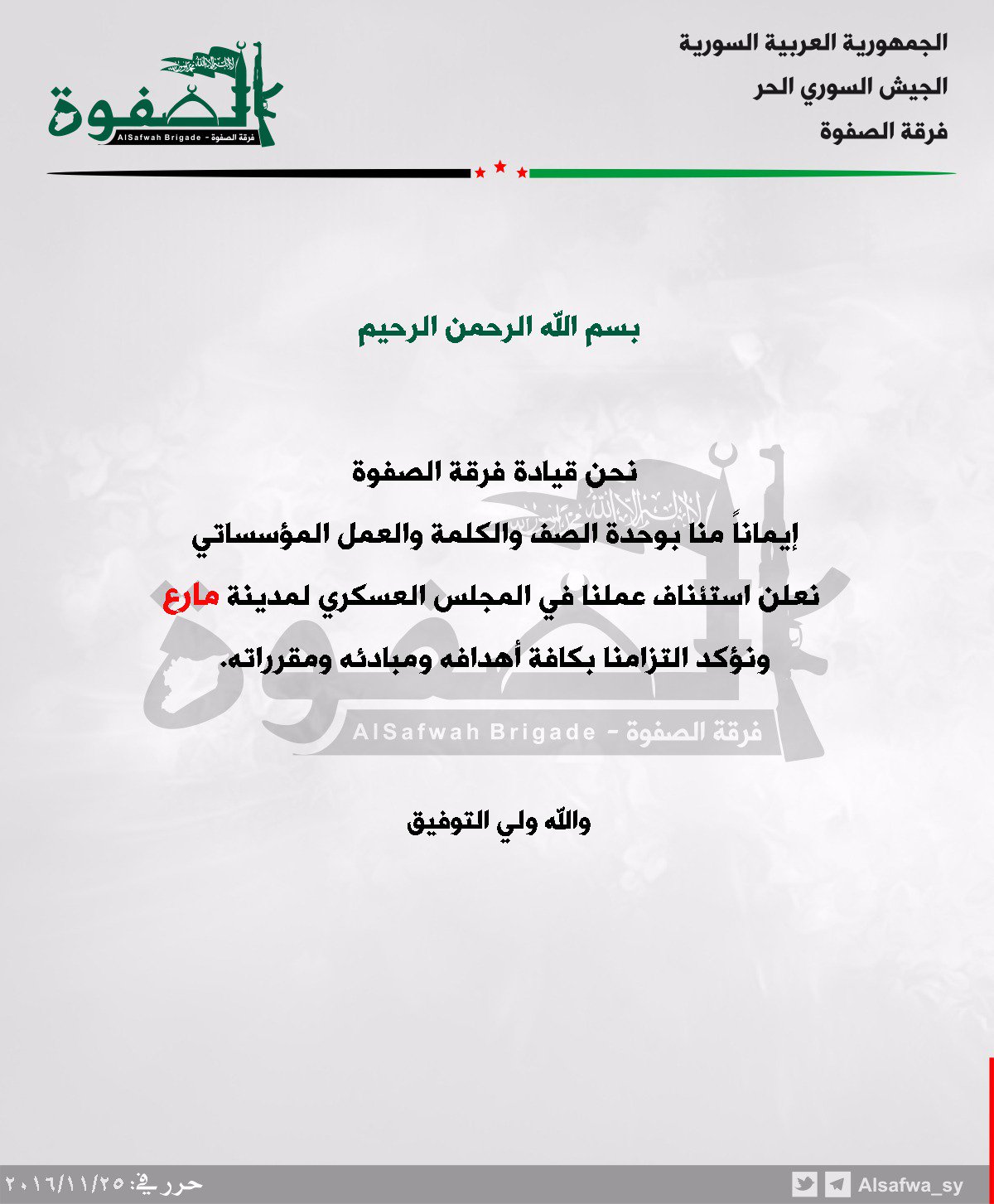 القيادة العامة لفرقة الصفوة تعلن استئتاف عملها في المجلس العسكري لمدينة مارع