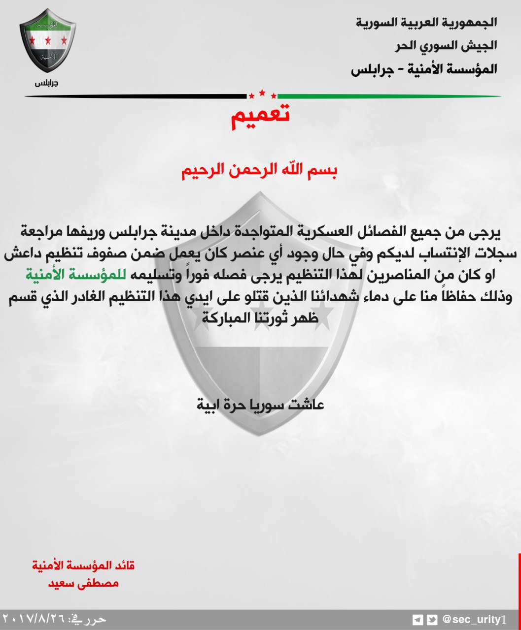 تعميم من المؤسسة الأمنية في جرابلس للفصائل بفصل أي عنصر كان منتسب لداعش وتسليمه لها