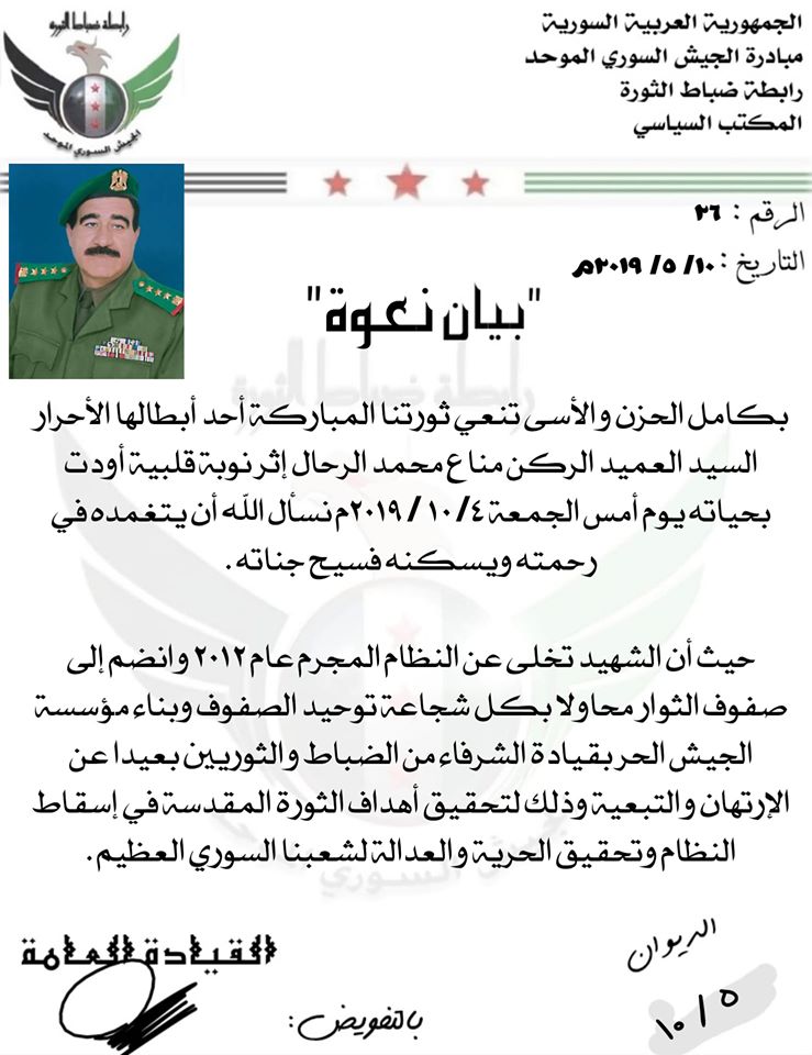 الجيش السوري الموحد ينعي وفاة العميد الركن المنشق مناع محمد الرحال